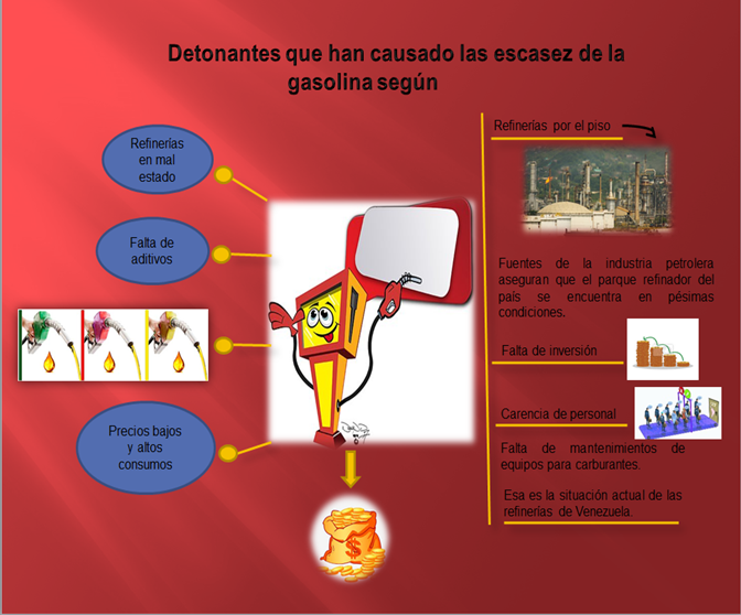 La escasez de gasolina se propaga en toda a Venezuela cada día que pasa. Los expertos en el tema aseguran que son varios los factores los que, en los últimos meses, han detonado la escasez de carburantes que salen desde las refinerías hasta las estaciones de servicio, y de allí es vendido, en un ínfimo precio, a los ciudadanos.